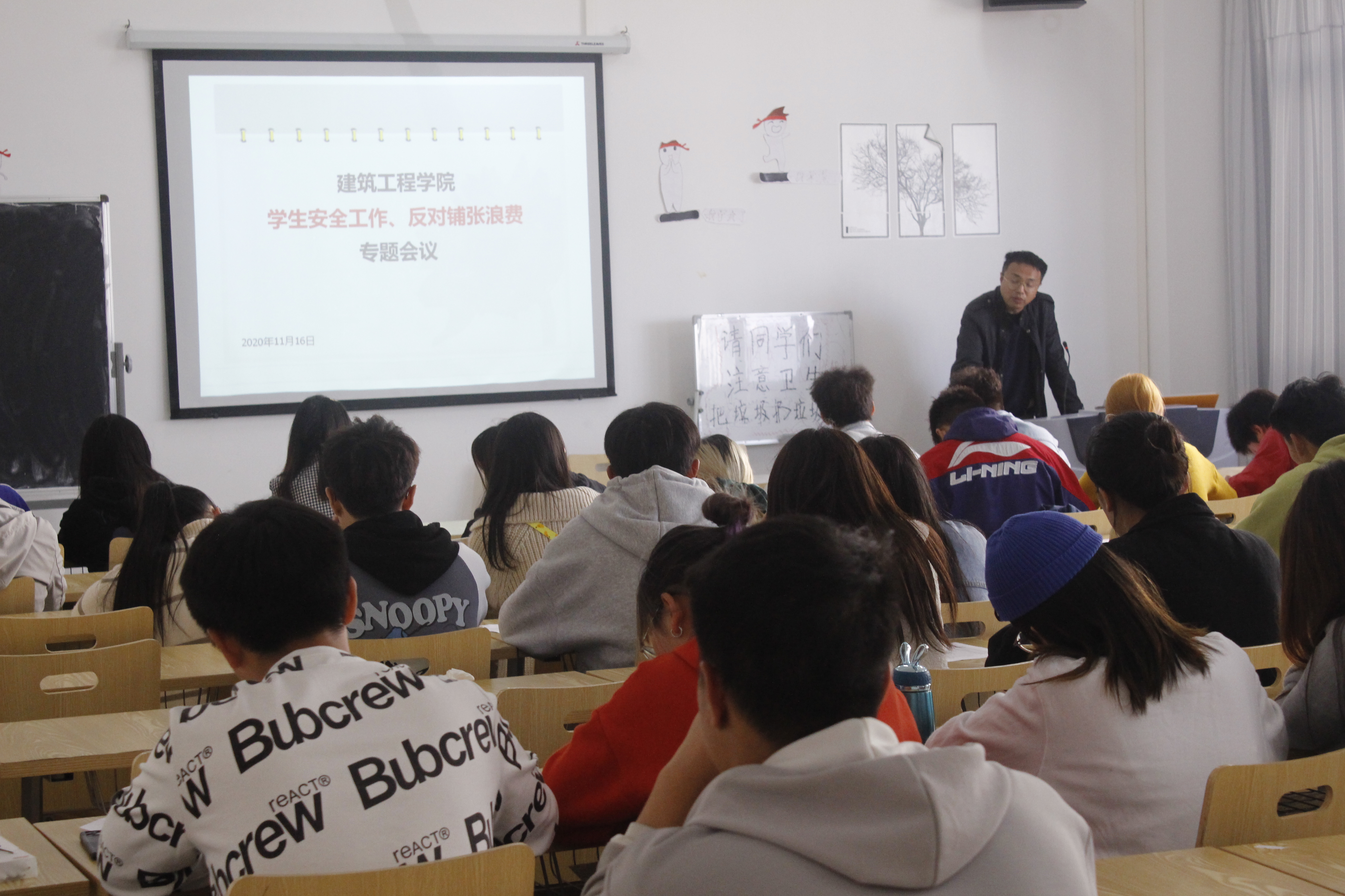 2020年11月16日中午12:40,437必赢会员中心学生安全工作、反对铺张浪费专题会议在建工楼A207召开。本次会议由437必赢会员中心辅导员周泉老师主持,437必赢会员中心党委副书记杨泰黔老师、教务科杨香琴老师出席了会议,学院各班班长及团支书参加会议。