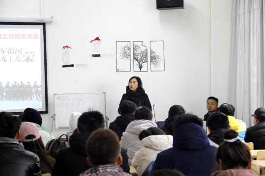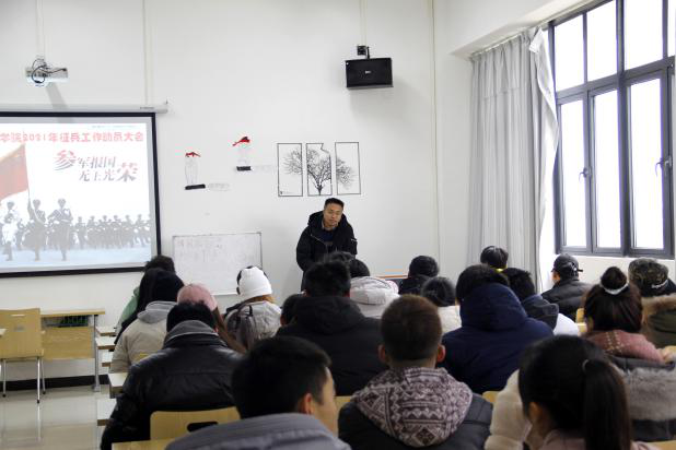 本次会议主题2021年大学生应征入伍动员。会上,周泉老师详细介绍了国家和学校对于大学生入伍的相关政策,针对2021年上半年和下半年征兵入伍报名时间、报名地点、体检等征兵入伍中的常见问题进行了说明,同时解答了现场同学的提问。周泉老师还给同学们算了入伍的“三笔账”,鼓励在校大学生积极入伍,为大学生涯添一抹军营风采。