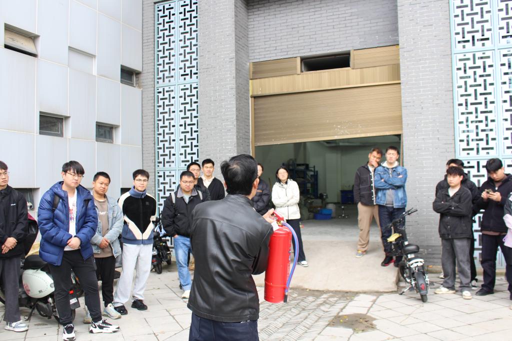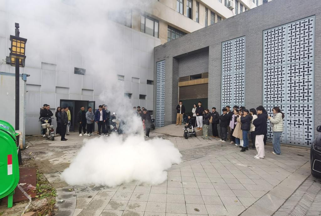 火灾演练模拟电器设备短路引发火情。实验管理人员现场指导灭火器、湿毛巾等灭火工具的正确使用方法,师生迅速响应,完成断电、初期灭火、呼叫消防车及人员疏散等一系列操作。通过实战演练,参训师生掌握了火灾初期处置与逃生自救的关键技能,进一步增强了安全防范意识。