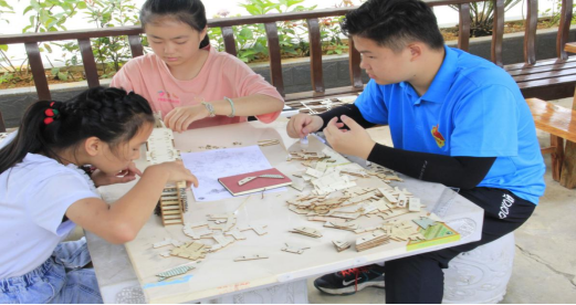 在志愿者们的耐心指导下,模型搭建得很顺利,通过志愿者们的讲解,孩子们对于中国建筑中的榫卯结构有了一定的了解,搭建的过程中也会不时提问志愿者一些专业问题,很快,在大家的共同配合下,岳阳楼、黄鹤楼、风雨桥,吊脚楼等模型一个个搭好了。